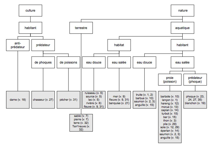 La structure classificatoire dégagée ici ne prétend pas à l’exhaustivité ni à l’exclusivité. Ainsi, on pourrait, par exemple, distribuer les éléments en tenant compte du fait que le texte est traversé de l’opposition petit / grand, susceptible de particularisations diverses. Elle oppose aussi bien les grandes étendues d’eau aux petites, les gros poissons aux petits, le phoque au blanchon, que les collectivités aux individus (les collectivités humaines et animales et la dame; les poissons grégaires/solitaires) voire, malgré l’inversion dans la séquence érosive, la pierre au sable qu’elle devient (v. 7).